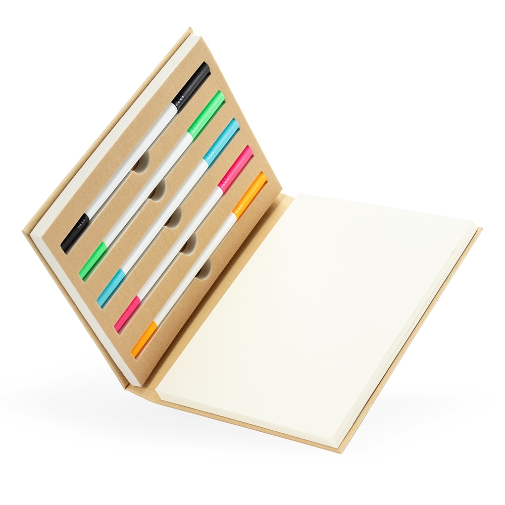 Bloco de anotações com capa dura em kraft e fechamento por elástico. Possui aproximadamente 80 folhas de tonalidade marfim sem pautas e cinco canetas coloridas de ponta dupla: uma fina e outra tipo pincel.